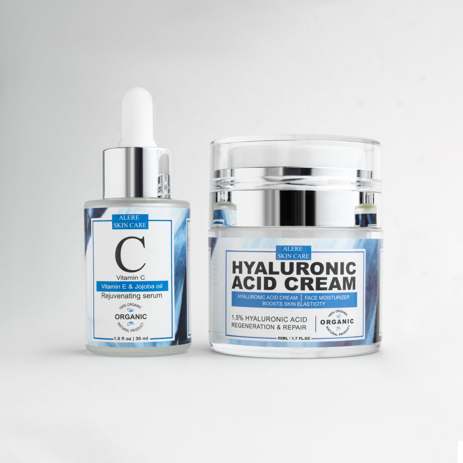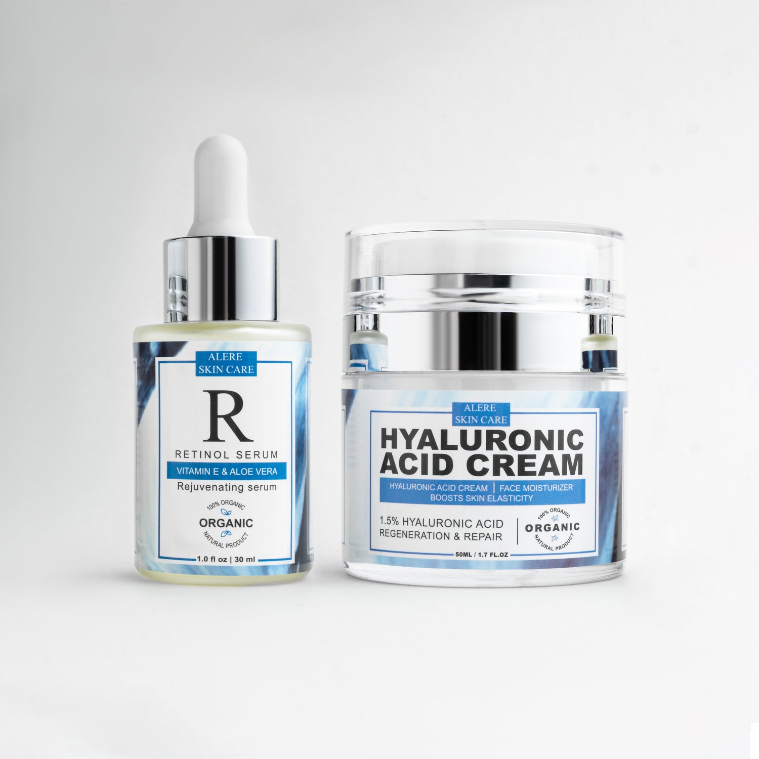 In the morning, apply Vitamin C Rejuvenating Serum followed by Hyaluronic Acid Moisturizer. At night, apply Retinol Rejuvenating Serum followed by hyaluronic acid moisturizer.